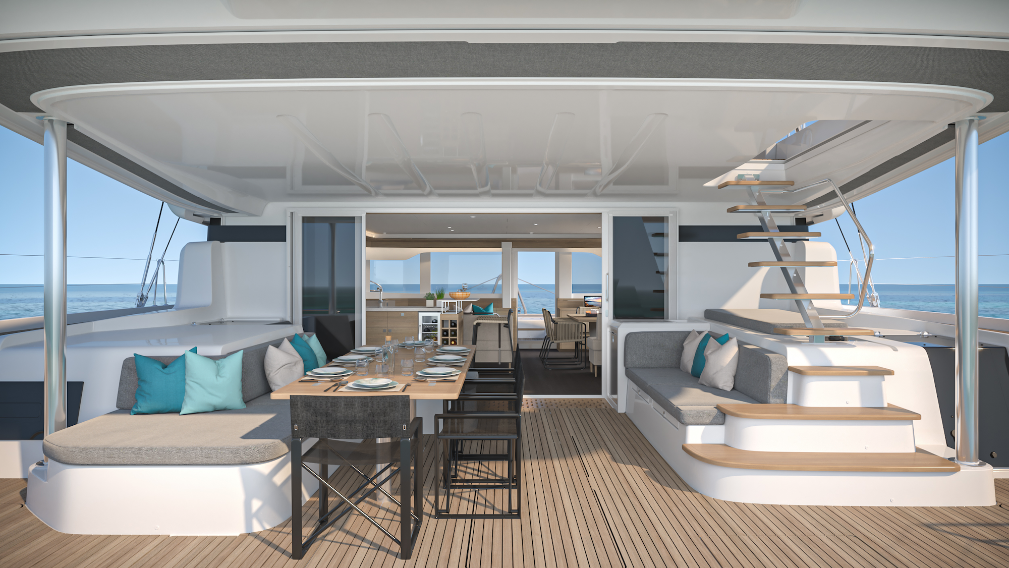 The Lagoon 60 features two large saloon doors connecting the forward and aft cockpits, all on the same level floor. “There are no steps, ensuring a seamless flow, whether you’re inside or outside.”