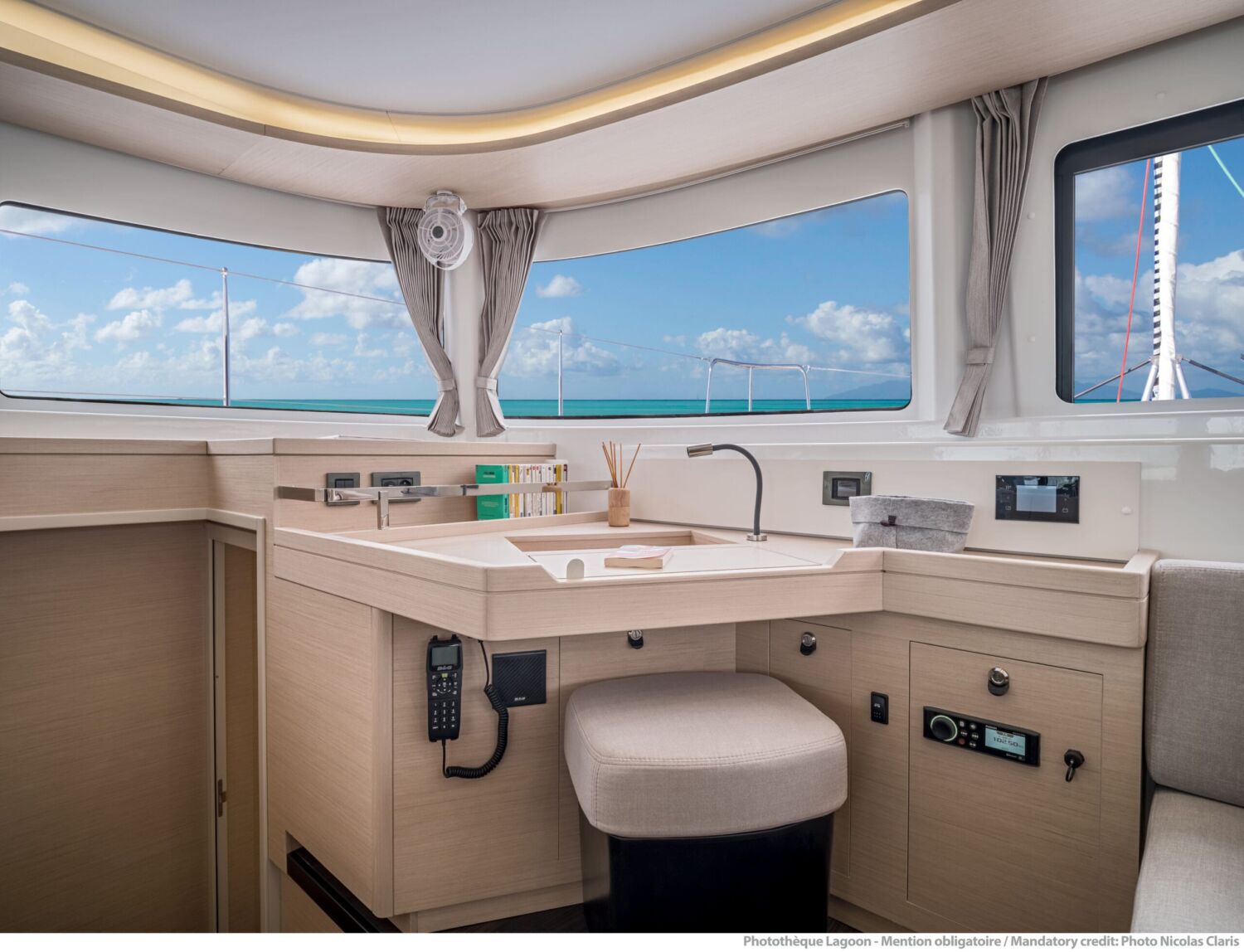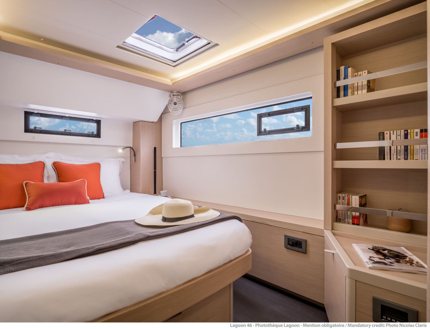 With its seamlessly integrated cockpit, the Lagoon 46 offers unparalleled horizon views. The flybridge is a versatile space, combining sundecks and a full helm station for ease of handling. The cockpit, with ample storage, sliding bench seating, and an exterior galley, transforms into an inviting living area for up to twelve people, perfect for creating cherished memories. Inside, the Lagoon 46 boasts unmatched interior volume, blending comfort and practicality in a refined atmosphere.