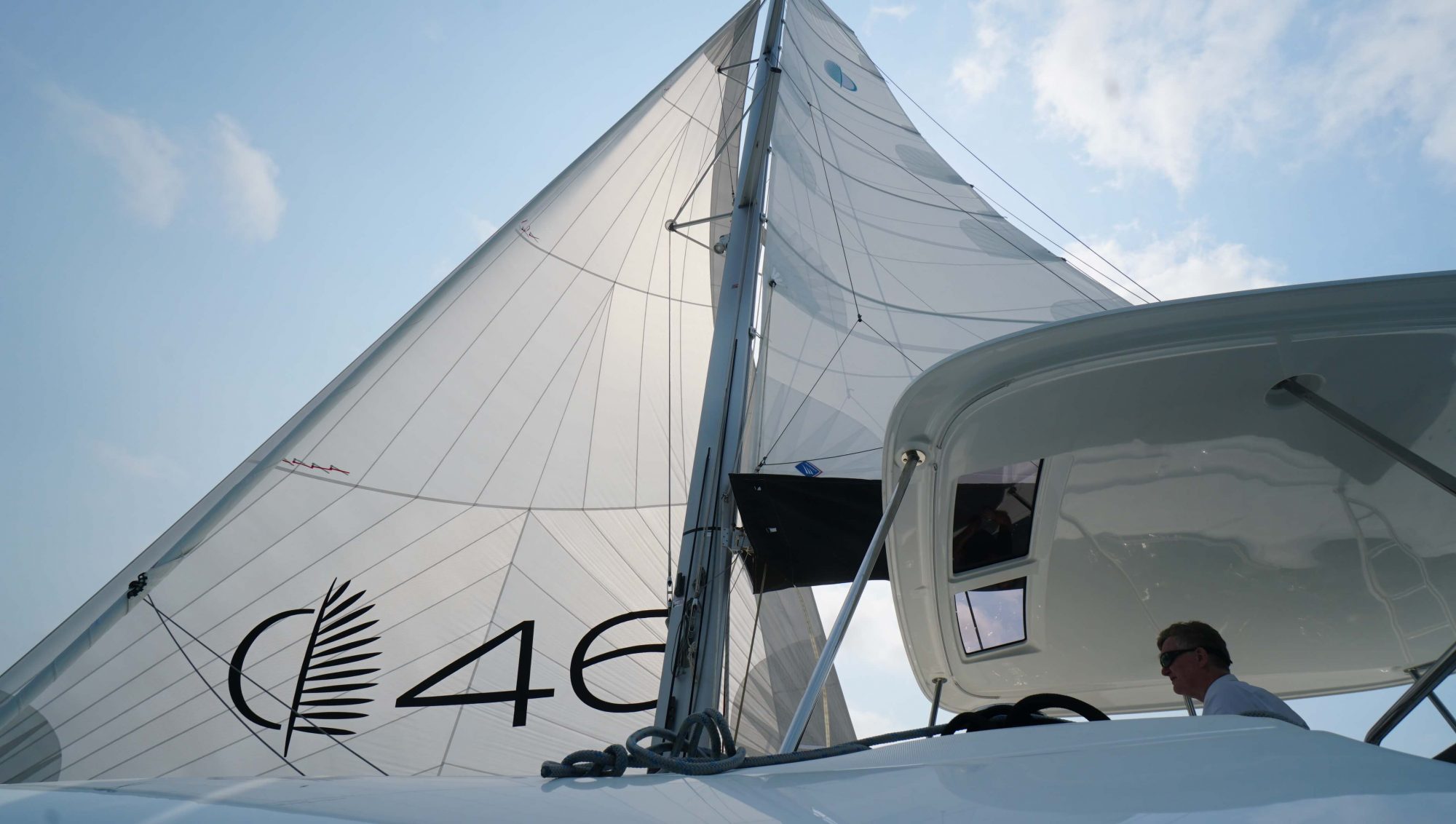 Despite both hull length and beam being around five percent bigger than the 450, Lagoon’s designers say the displacement of the new 46 is actually two per cent lighter. There has been a change in construction method at Lagoon, previously the hulls below the waterline were solid fibreglass, but now they have incorporated infused polyester with balsa core for the entire hull, above and below the waterline. Plus the redesigned hulls are wider and fuller providing increased buoyancy. This model is still quite heavy in its class but, with the increase in sail area, its sail area to displacement ratio is not far behind the more racier catamarans on the market. It is the configuration of the sail plan that ensures the yacht remains easy to sail. So, how well does it sail?
