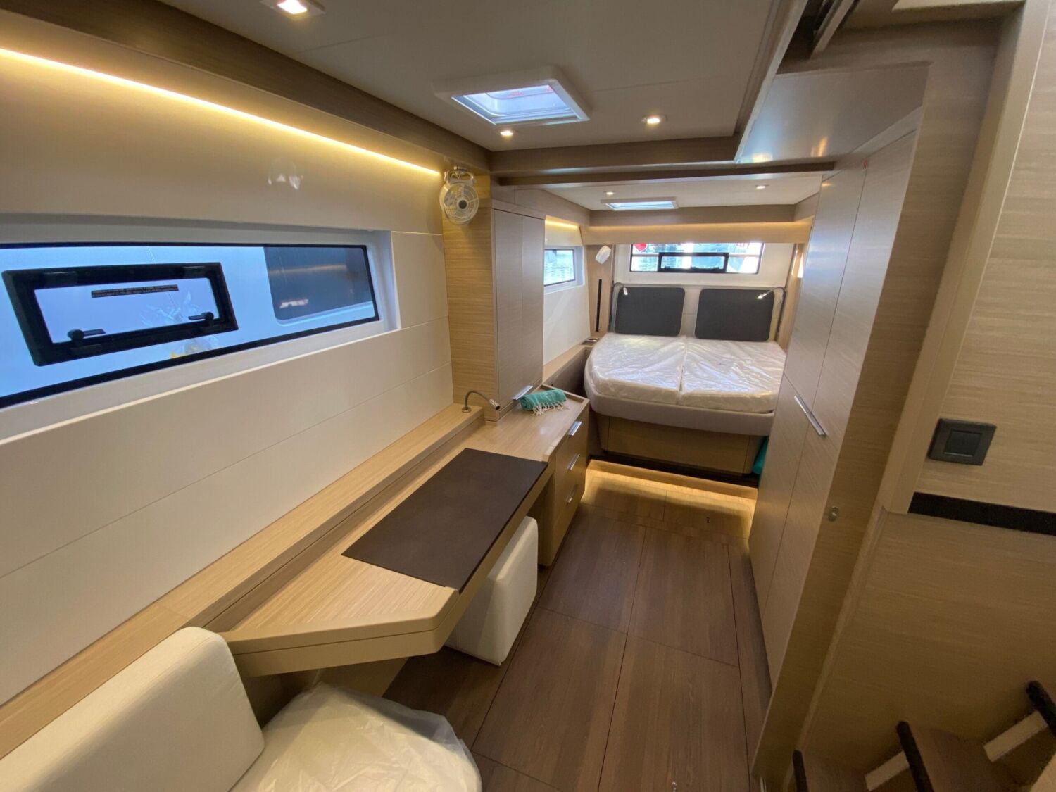 “I wanted a big, spacious saloon that you could see through for transparency. I wanted it to feel like a home, like a floating apartment. I thought regarding the kids, on the 42 specifically, we can steer the boat from here on the same level, it’s not a separate area … and the entire thing can be enclosed without it being a visual and physical barrier,” said Lara.