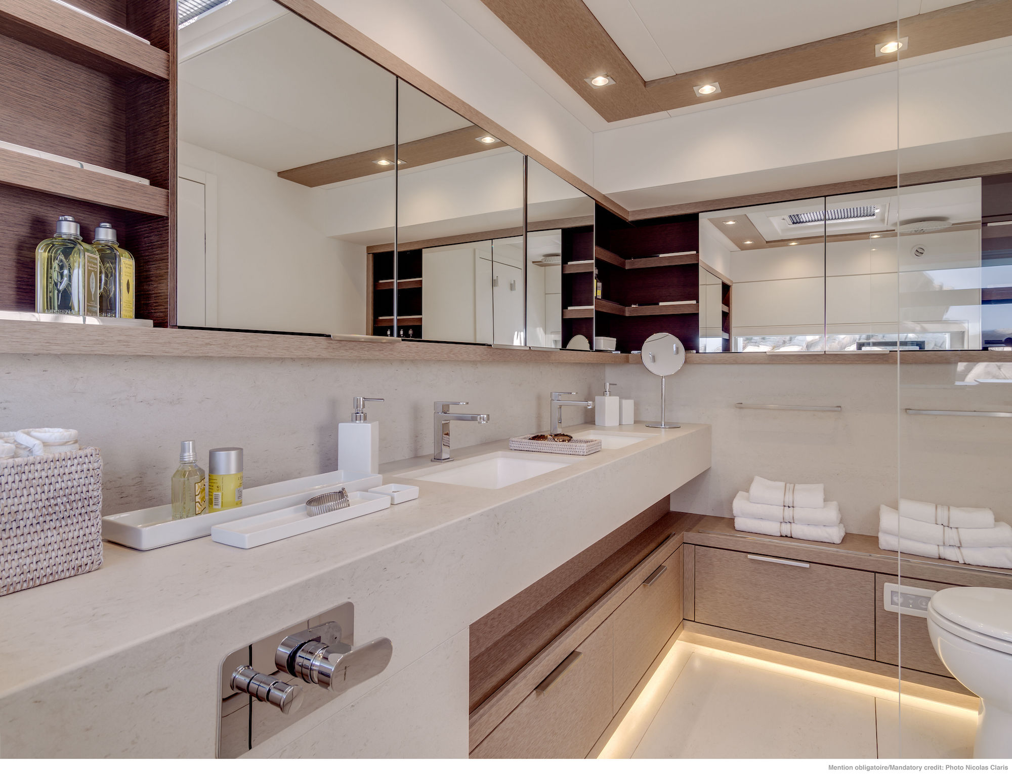 Located in the forward hull area, this exquisite private area enjoys living space on two levels – one on the main deck and the other in the hull.