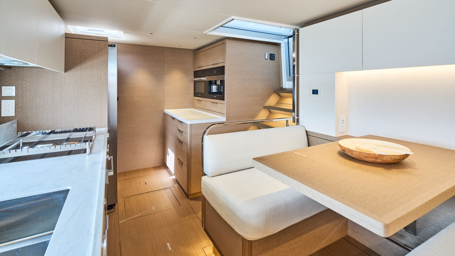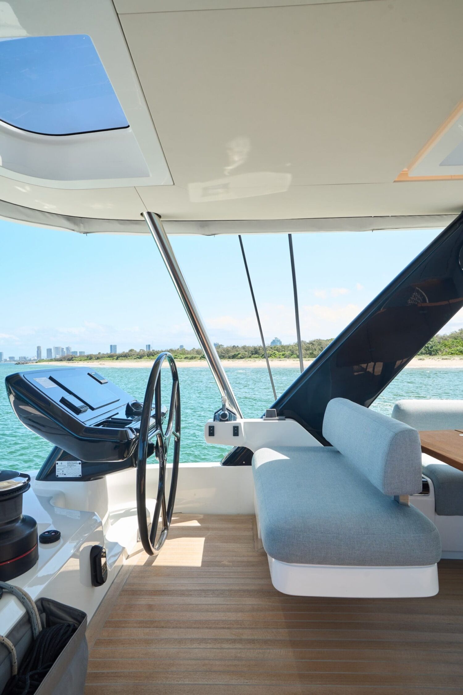 “I wanted a big, spacious saloon that you could see through for transparency. I wanted it to feel like a home, like a floating apartment. I thought regarding the kids, on the 42 specifically, we can steer the boat from here on the same level, it’s not a separate area … and the entire thing can be enclosed without it being a visual and physical barrier,” said Lara.