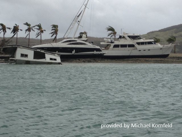 When the Kornfelds returned to their boat there was no power or water as expected, but they started up their generator and counted themselves lucky that they only lost their screens and canvas, remaining otherwise unscathed.